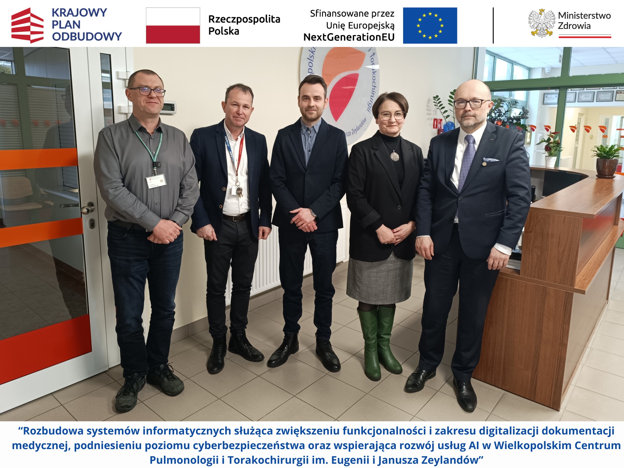 Wielkopolskie Centrum Pulmonologii i Torakochirurgii im. Eugenii i Janusza Zeylandów podpisało umowę z Ministerstwem Zdrowia na realizację projektu pn. „Rozbudowa systemów informatycznych służąca zwiększeniu funkcjonalności i zakresu digitalizacji dokumentacji medycznej, podniesieniu poziomu cyberbezpieczeństwa oraz wspierająca rozwój usług AI w Wielkopolskim Centrum Pulmonologii i Torakochirurgii im. Eugenii i Janusza Zeylandów”.