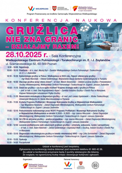 Uprzejmie informujemy, że 28 października 2025 r. w godzinach 9:30-14:00 na Sali Konferencyjnej w Wielkopolskim Centrum Pulmonologii i Torakochirurgii im. Eugenii i Janusza Zeylandów w Poznaniu przy ul. Szamarzewskiego 62, odbędzie się konferencja "Gruźlica nie zna granic - Działajmy razem!".