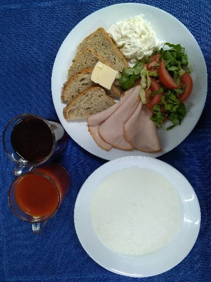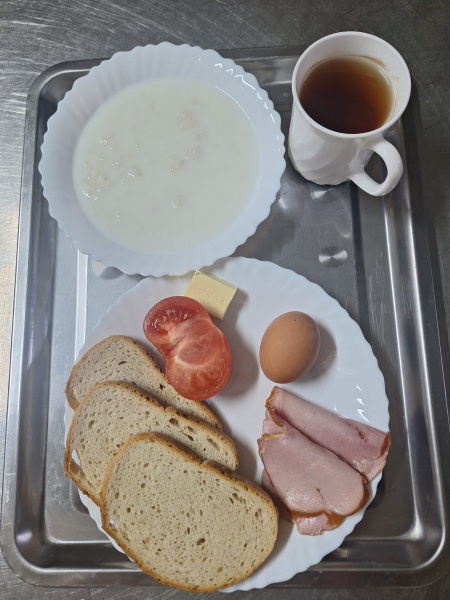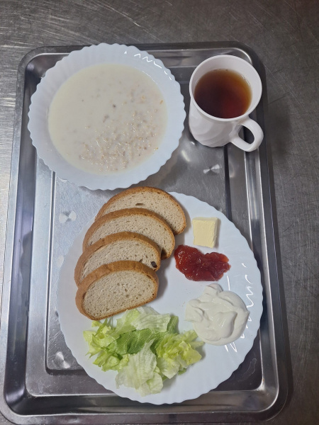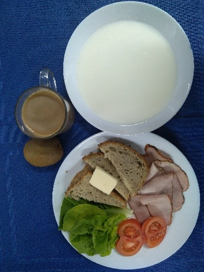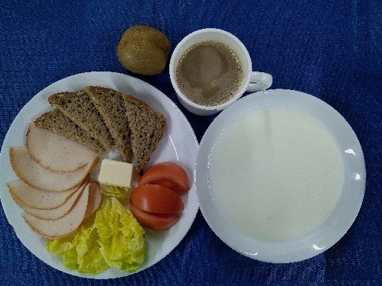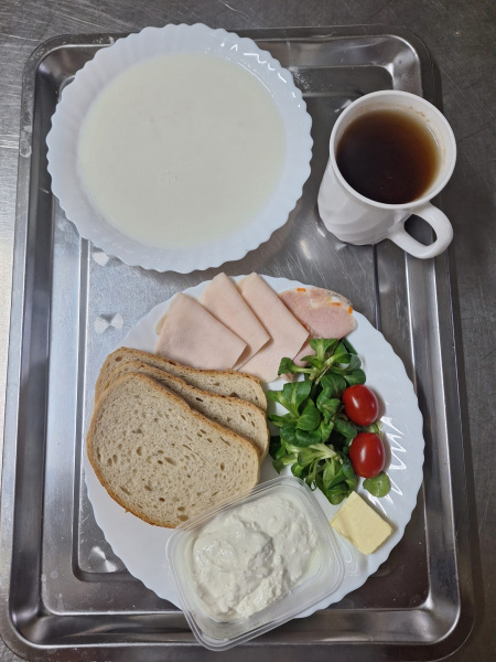 Herbata 250ml. Zupa mleczna z płatkami owsianymi 300ml. (1,7) Pieczywo mieszane 110g. (1) Masło 15g. (7) Ser biały 70g. (7) Wędlina 20g. Sałata z pomidorem 70g.