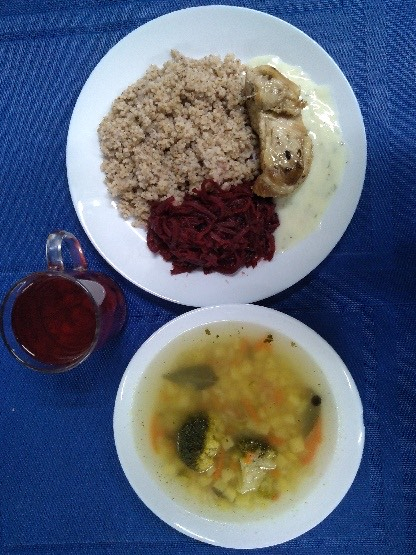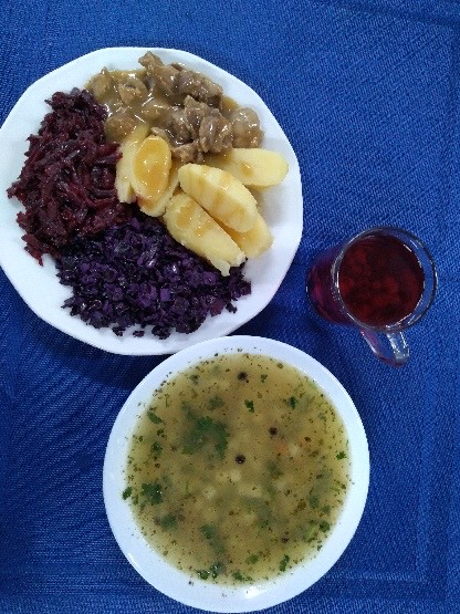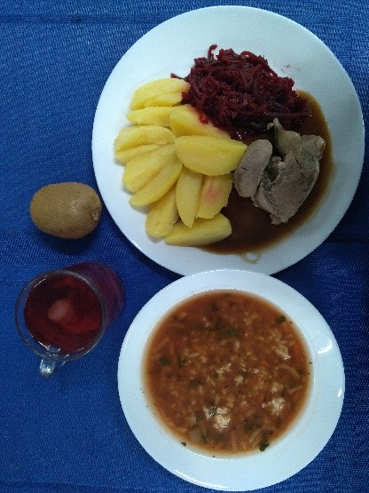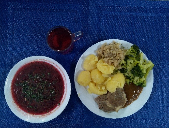 Zupa barszcz czerwony z ziemniakami 300ml. (1,3,7,9) Karkówka duszona 130g. Sos naturalny 100ml. (1,7) Ziemniaki 250g. Surówka z młodej kapusty 150g. Brokuł gotowany 200g. Kompot b/z cukru 250ml.