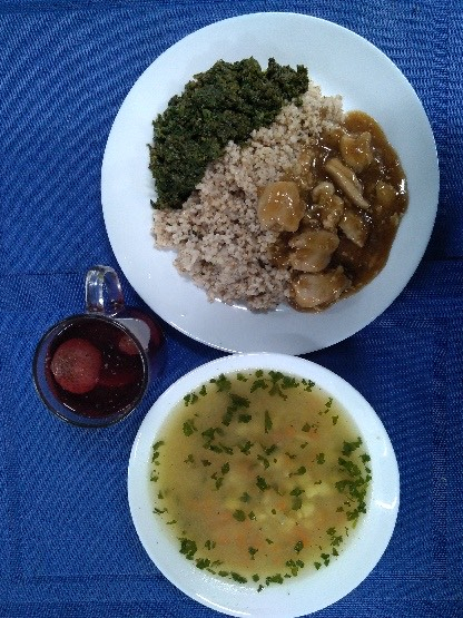 Krupnik 300ml. (1,7,9) Kurczak w potrawce 130/100g. (1,7) Ryż 200g. Marchewka z groszkiem 150g. Kompot 250ml.