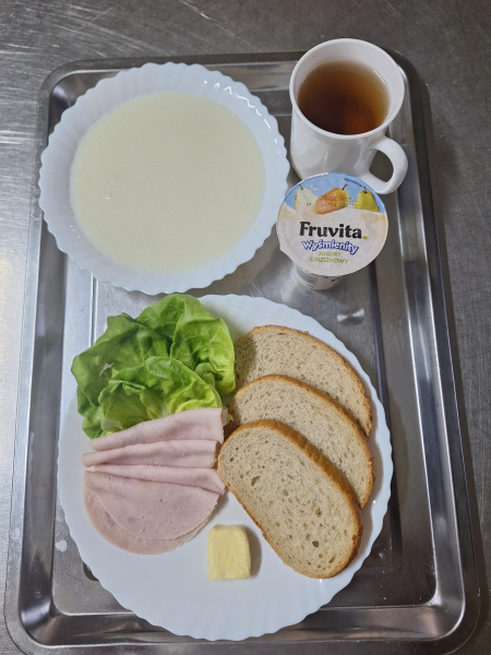 Herbata 250ml. Zupa mleczna z płatkami owsianymi 300ml. (1,7) Pieczywo mieszane 110g. (1) Masło 15g. (7) Ser biały 50g. (7) Dżem 25g. Sałata 30g.