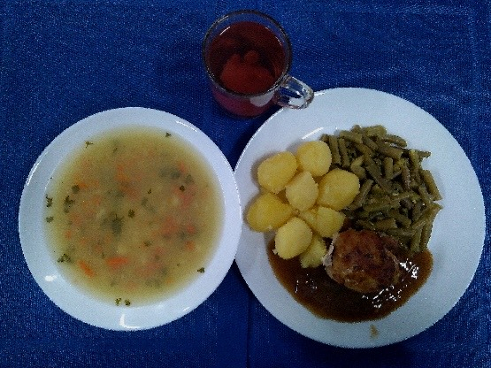 Zupa ziemniaczana z zacierką i zieleniną 300ml. (1,3,9,7) Kasza 250g. Łopatka duszona 130g. Sos naturalny 100ml. (1,7) Sałatka z ogórka kiszonego 150g. Fasolka szparagowa 200g. Kompot b/z cukru 250ml.