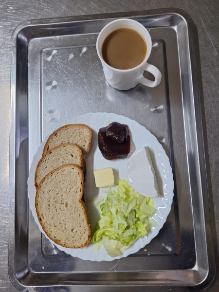 Herbata 250ml. (1,7) Pieczywo mieszane 110g. (1) Masło 15g.(7) Serek topiony 50g. (7) Dżem 20g. Sałata