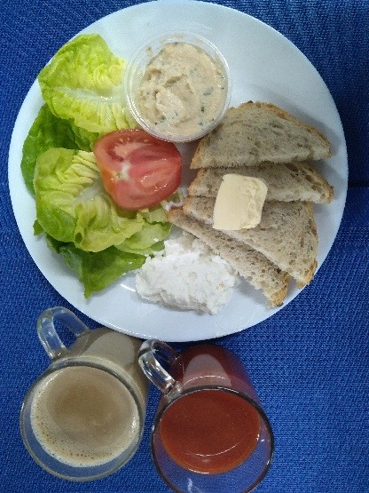 Kawa zbożowa z mlekiem 250ml. (1,7) Pieczywo razowe 110g. (1) Masło 15g. (7) Pasta z soczewicy 70g. (9) Wędlina 20g. Pomidor 70g.