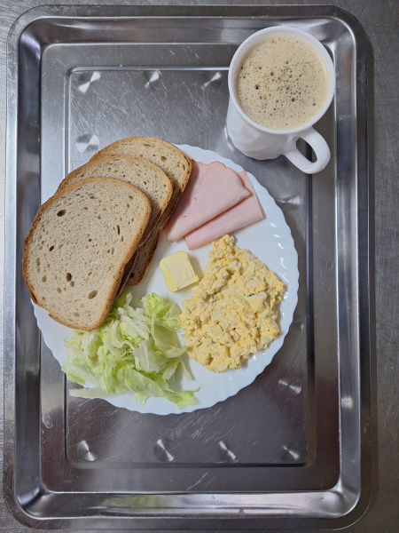 Kawa zbożowa z mlekiem 250ml. (1,7) Pieczywo mieszane 110g (1) Masło 15g.(7) Jajko gotowane 1 szt. (3) Majonez 10g. (3) Wędlina 50g. Sałata 30g.