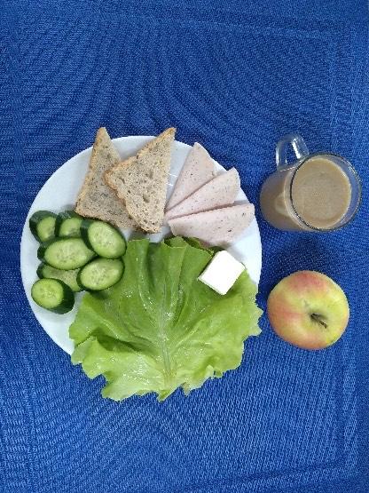 Kawa zbożowa z mlekiem 250ml. (1,7) Pieczywo mieszane 110g. (1) Masło 15g.(7) Ser żółty 20g. (7) Wędlina 50g. Sałata z ogórkiem zielonym 70g.
